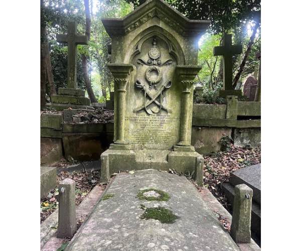 At Highgate, the list of interesting graves is well documented in the leaflet, which gives you a brief on 120 notable graves. The first find is Karl Marx’s original grave, although it is not listed in the guide pack . His grave was later moved to a more prominent site when he became more famous and acceptable. Close by, we find the graves of two boys who drowned, though five others also perished with them; worth a bit of investigation. Douglas Adams, the founder of The Hitchhiker’s Guide to the Galaxy, who died in 2001, has a modest grave. Visitors have left items around it, such as Rubik’s Cubes, pens and other mementoes.