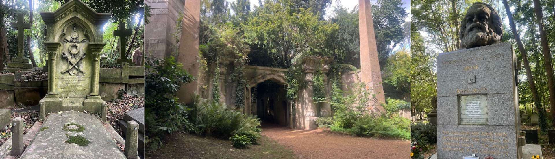 More walking reveals more interesting people interred. A famous Russian who had been granted asylum in the UK but was murdered in London in 2006 is buried in Highgate. A family of horse slaughterers for Queen Victoria have a tomb. A dog sculpture above a notable grave has been vandalised.